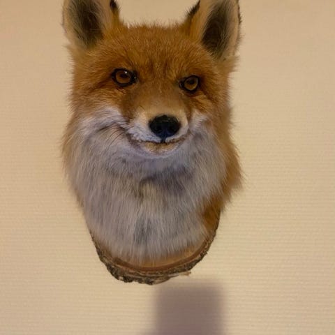 Ukjent merke Rødrev skulptur laget med ekte pels montert på en steinbase. Skulpturen viser en rødrev i stående posisjon på en stein. Den har detaljer som pels og naturlig farger som etterligner et ekte dyr.