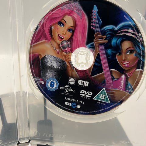 Barbie Barbie Girls CD med musikk fra Barbie Girls. CD-en har et rosa omslag med bilder av Barbie og stjerner. Passer for fans av Barbie og musikk fra Barbie Girls.