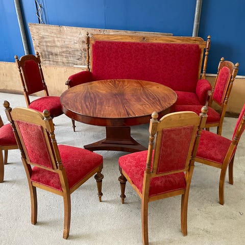 spisestue som inkluderer et rundt bord, en sofa, to lenestoler og tre vanlige stoler. Møblene har mørk grønn fløyelsstoff og utskåret treverk. Stolene er trukket om.