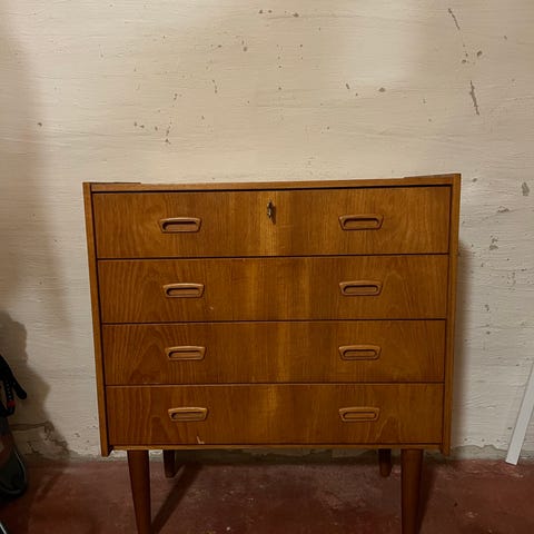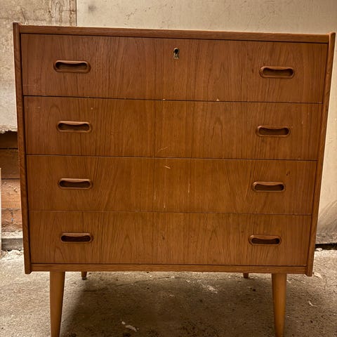 Selger denne flotte kommoden i teak. De største skuffene kan være litt vanskelig å åpne hvis det er tungt i skuffen. Den er slitt på toppen, men likevel i fin stand og blir ekstra fin om man tar et lag med puss og olje☺️