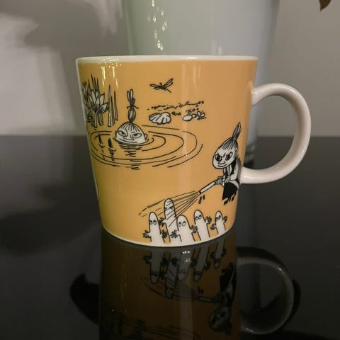Selger den klassiske Mummikoppen Mørkeblå fra Arabia, produsert ca. 1991–1999. Fin farge og motiv rundt hele koppen, ingen sprekker eller nagg . Glansfull både innvendig og utvendig, perfekt for både samlere og til hyggelig hverdagsbruk.