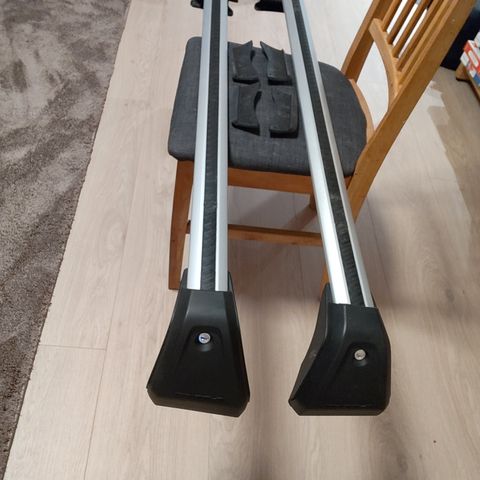 Original Porche takstativsett med to tverrbjelker i aluminium og monteringsfester. Passer for montering på bilens tak for transport av ekstra last. Fargen er sølv med svarte festedetaljer. Nær ubrukt ligget på et loft. Passer til Porsche Cayenne 2002 -2010