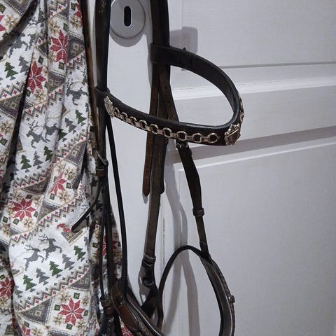 Nydelig, brunt hodelag selges med V form og "diamanter", hodelaget er inkludert med tøyler. Strs cob/full (har gode justeringer).