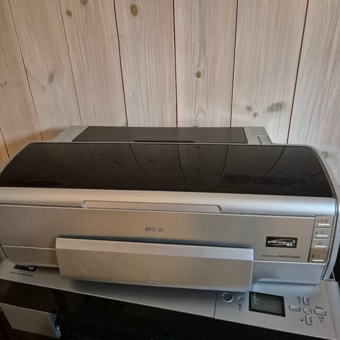 Fotoprinter fra epson som er noen år gammel. Det er en stund siden den var i bruk, men leverer knallgode prints. Man må påregne å bytte ut blekk og kjøre noen runder med rens for å få den helt god igjen. Har gjort dette noen runder selv når det har vært lenge siden bruk. Har to blekkpatroner som følger med.