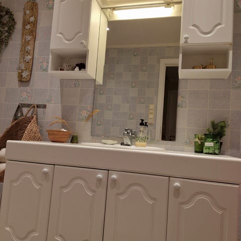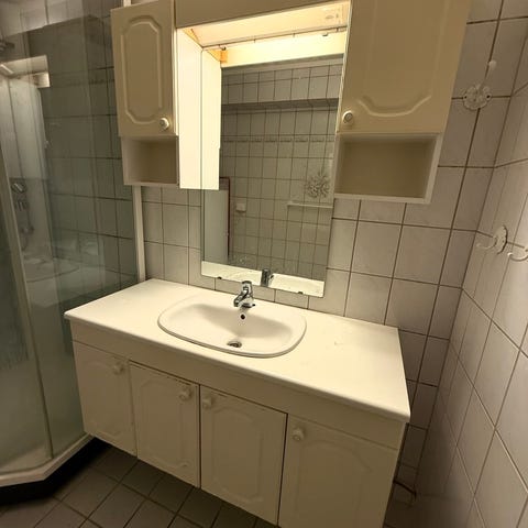 Baderomsmøbel med servant, speil og oppbevaringsskap. Møbelet er hvitt og laget for bruk på bad. Inkluderer servant med armatur og speil med skap for oppbevaring.