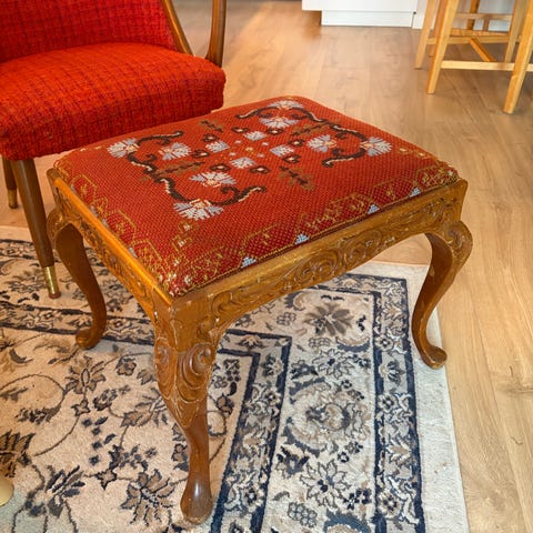 søkeord: krakk benk sittebenk puff entrebenk trebenk kiste krakk lagring lagringplass ekstra oppbevaring vintage retro stoff striper