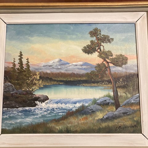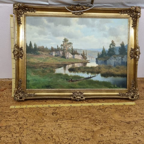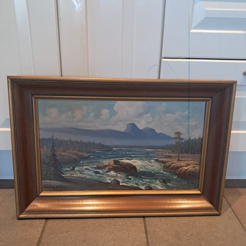 Oljemaleri som forestiller et landskap med elv, trær og fjell, innrammet i en dekorativ gullfarget ramme. Maleriet har et naturlig motiv med fokus på naturens elementer.