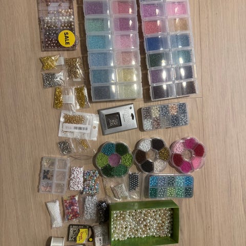 Stor pakke med perler og div. tilbehør. Se bilder for detaljer av innholdet. Noe helt nytt, noe er pent brukt. Noensmykkedeler er belagt med 14K gull.