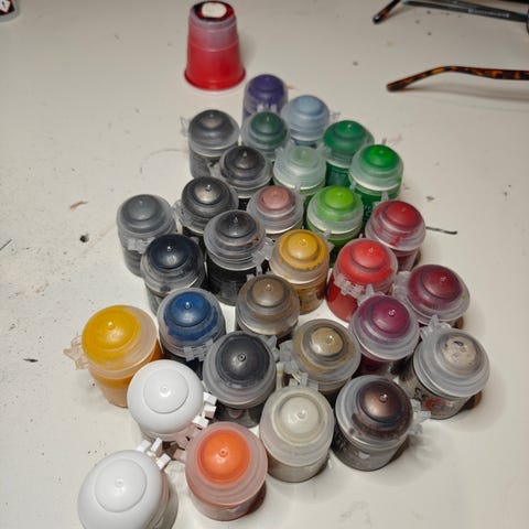Army Painter Project Paint Station malestand med 30 holdere for Warpaints og 6 pensler. Inkluderer en arbeidsstasjon for organisering og bruk av malingsflasker, designet for modellmaling og hobbybruk.