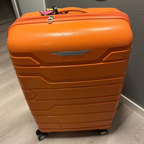 Kobberfarget mellomstor koffert selges. Kodelås. Mål ca. 40 b x 23 d x 67 h. Fått noen riper ved bruk, men ellers fin.