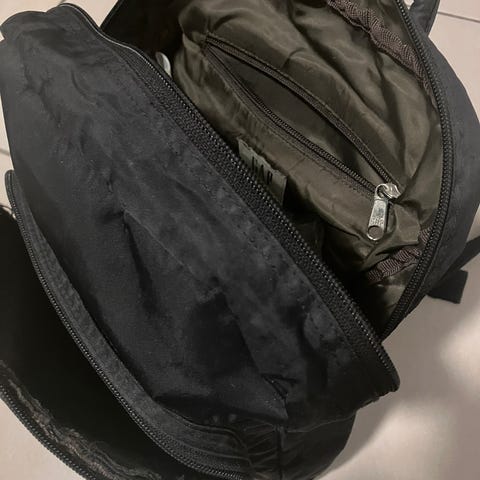 Liten sort ryggsekk, kan utvides. Mål ca. 38 h x 18 b x 8/17 d.