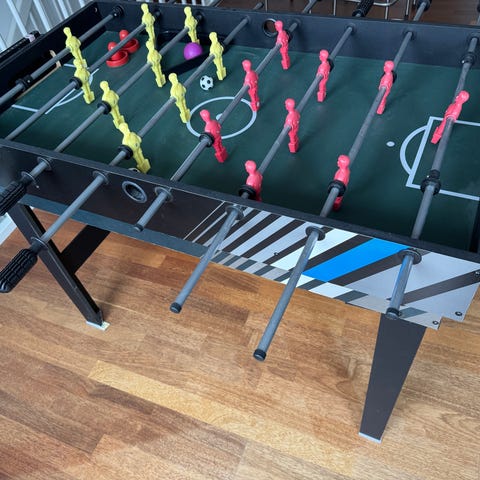 Willi Max Air bordfotballspill med bord i svart og spillere i rødt og gult. Bordet har stenger for fotballspill og en glatthvitt air hockey-overflate med markeringer i rødt. Egnet for innendørs bruk.