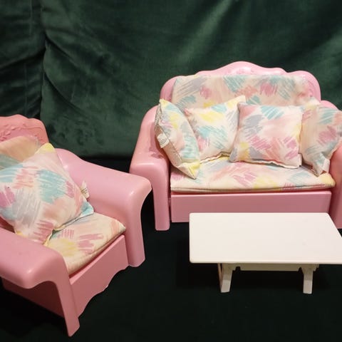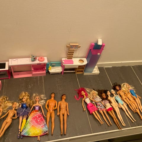 Barbie dukkehusmøbler sett med flere møbler og tilbehør i rosa og blå farger. Inkluderer blant annet sofa, badekar, skap, speil, vask, bord og stoler. Laget i plast, egnet for lek med Barbie-dukker.