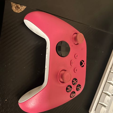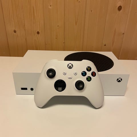 Xbox Series S konsoll i hvit farge. Inkluderer to kontrollere, en hvit og en svart, samt nødvendige kabler for tilkobling og strøm.