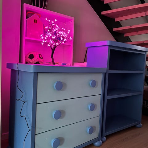 Selger denne gule, fine hyllen til barnerom, baset på IKEA kallax. Følger med seks kurver, selv om kun fem er avbildet.