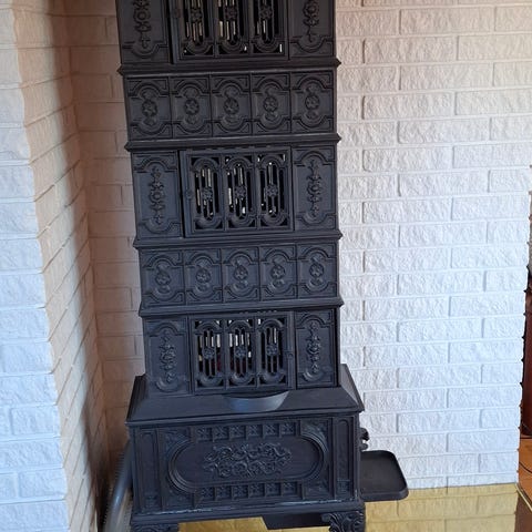 Høyde: 138 cm. Ovnen har stått i et lite pikeværelse i en byleilighet og er ikke beregnet for oppvarming av et stort rom. Ovnen må hentes.