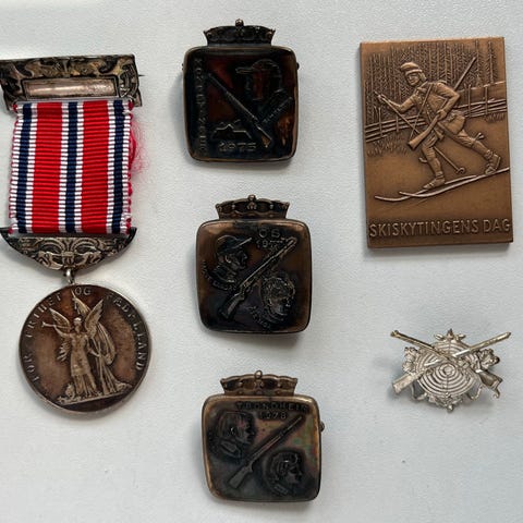 Et flott samleobjekt innen norsk skytehistorie, militære ferdighetsmerker og idrettsmedaljer.