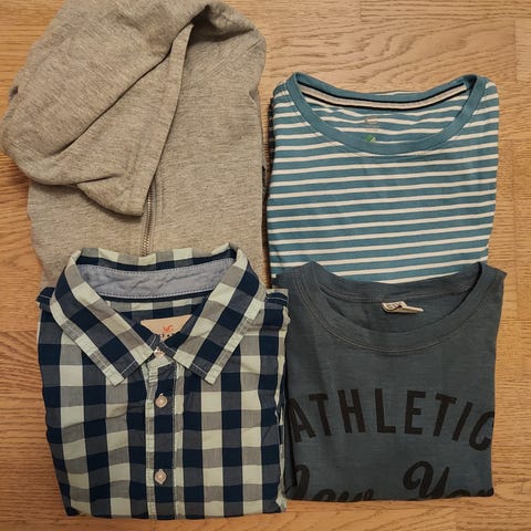 Tre gensere (vasket, men tror ingen av dem kom i bruk), en hettegenser og en bukse. Kr 50 per stykk. 250 kr for pakken. Kan kjøpe bare noe. By da for det du vi ha.