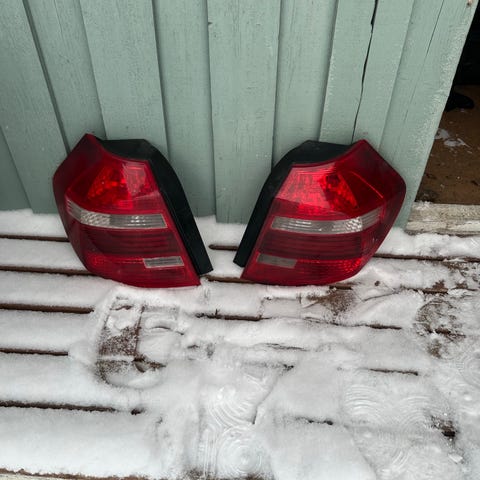 BMW E87 baklys sett med venstre og høyre lys. Lysene har rød og hvit farge og er laget av plastmateriale. Passer til BMW E87-modellen.