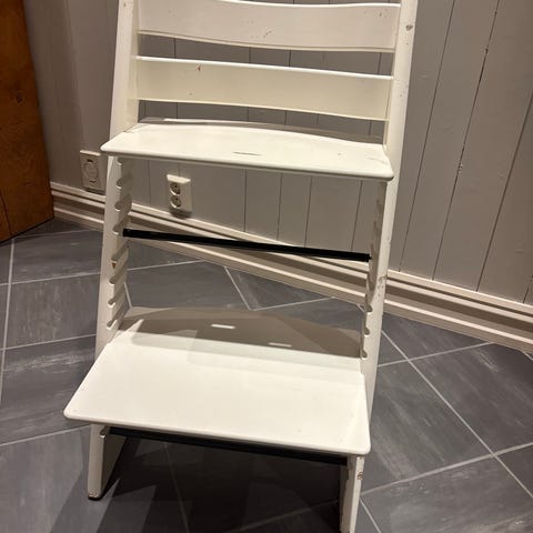 Stokke Høy barnestol i hvit farge. Stolen er designet for barn og har justerbare seter og fotstøtte for tilpasning etter barnets størrelse.