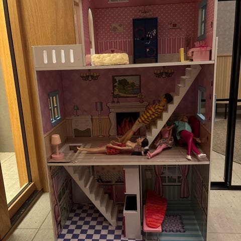 Selger stort dukkehus. Det funker med de reparasjonene som kan ses på bildene. Det følger med noen møbler som kan ses på det ene bildet.