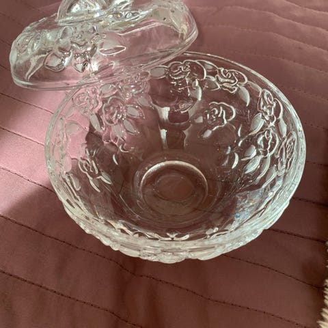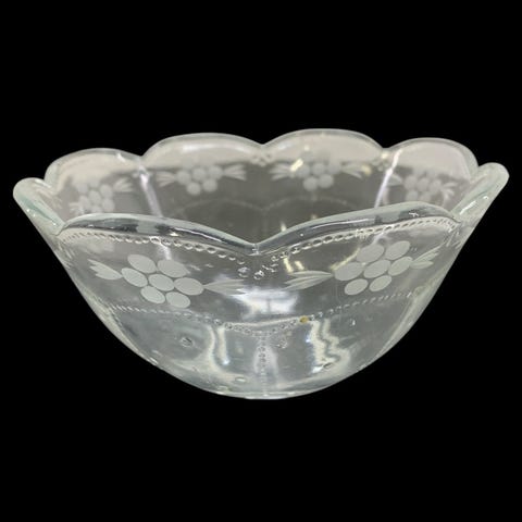 Dekorasjonsbolle med motiv av bær og blader. Bollen er hvit med flerfarget dekor og har to håndtak. Egnet til servering eller som dekorativ gjenstand.