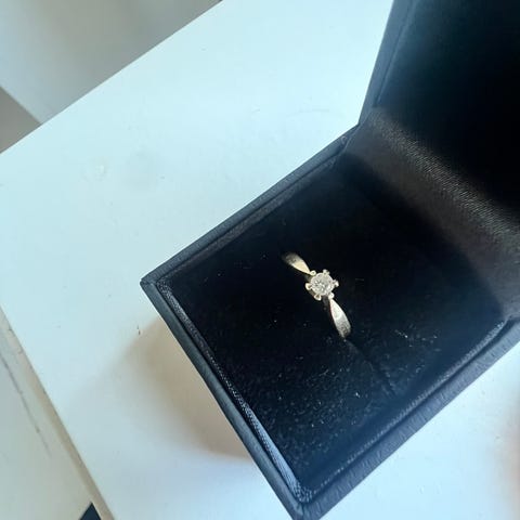 Diamanten leveres med originalt diamantsertifikat, som følger med i salget (se bilder). En tidløs ring som passer perfekt som forlovelsesring, gave eller til deg som ønsker noe enkelt og elegant.