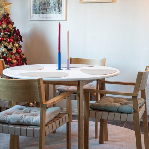 Solid, rundt kjøkkenbord med innebygd klaff. Litt slitt og og noen hakk på bena, men ingen skader som berører funksjon. Trenger litt TLC, sandpapir og maling. Diameter 115 m og bredde på klaff 50 cm, så lengde utslått blir 165 cm. Det er god plass til 6 personer.