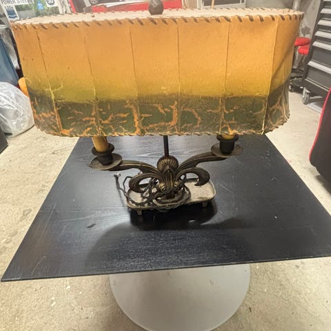 Antikk bordlampe – dekorert keramikk og frostet glasskuppel