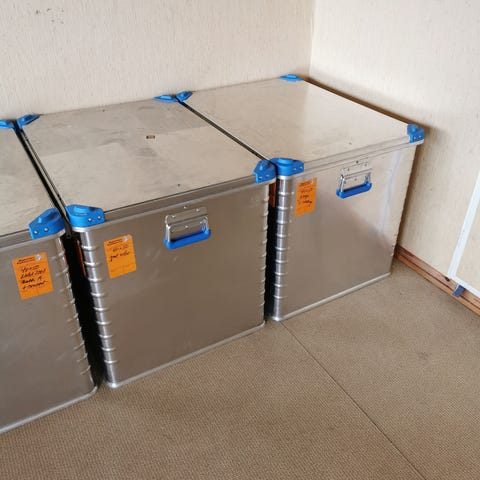 Tre transportkasser i aluminium selges. Har merker, men er i god stand.