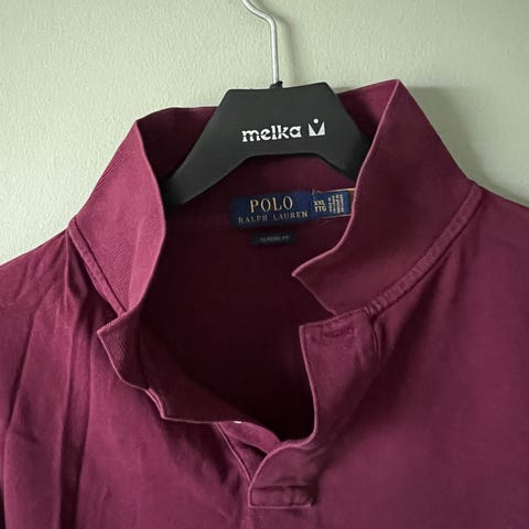 Lite brukt hvit pikue T-skjorte fra P.R.L., ingen synlig bruk. Ved oppbrettet krage sees merket på plagget, se bildet.