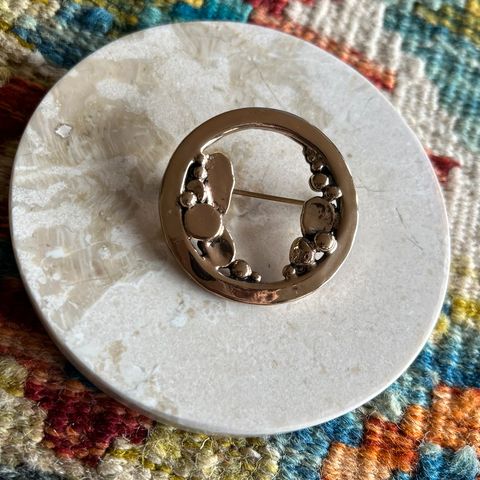 Håndskåret pyntenål av knivmakar Astrid Espelid, Hjartdal, Telemark. Skåret i lær. Diameter 6 cm.