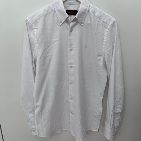 Stilig Tommy Hilfiger skjorte, i litt tykkere stoff enn en vanlig finskjorte. Hvit farge, størrelse 176 (tilsvarer str S). Skjorten har knapper. Som ny - ikke synlig brukt. Ny pris kr. 1399,-.