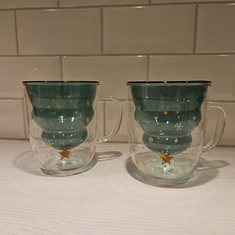 3 stykk krus i glass med hest og vogn motiv og grantrær selges samlet.