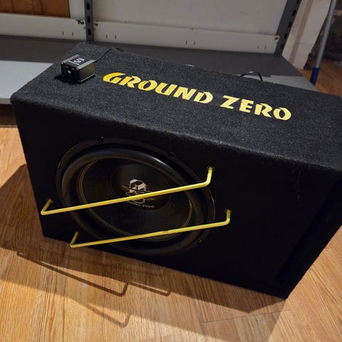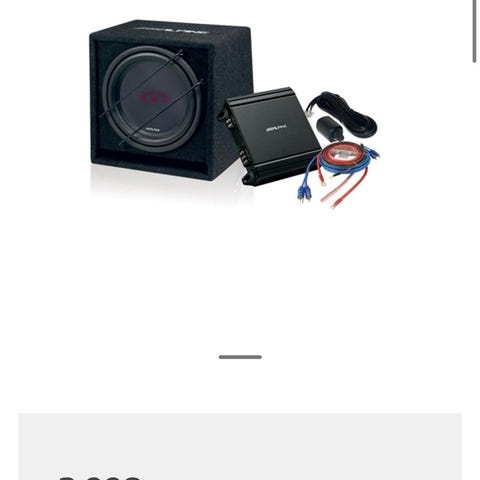 Alpine Type R 12 kraftige 12" elementer som spiøler ekstremt bra og veldig fint. Står i en Portet Kicker 2x12" kasse med hurtigterminal så er enkel å ta inn og ut av bil.