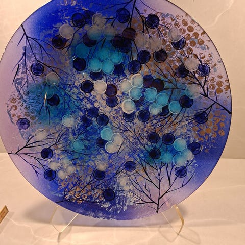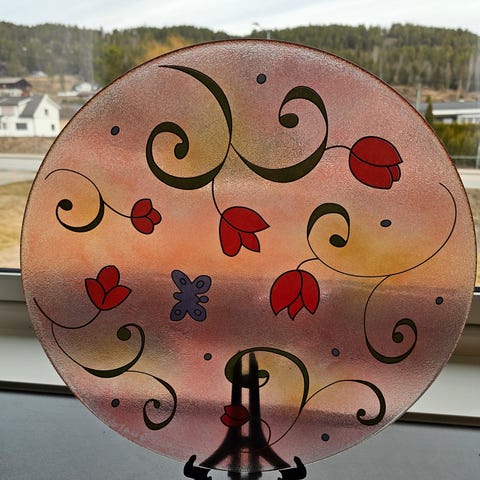 Stenige slott dekorasjonsfat med et kunstnerisk motiv som viser to ansikter. Fatet har en rund form og er egnet for dekorasjon i hjemmet. Det følger med eget oppheng til vegg. Hentes i Asker.