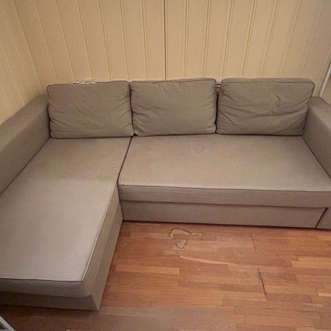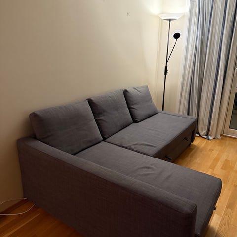 Sovesofa i grå stoff med moderne design. Sofaen har et enkelt og stilrent uttrykk med rette ben i metall. Egnet for opphold og overnatting i mindre rom.