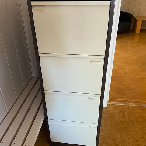 Arkivskap/-skap med sjalusi-dør selges. Vært i vårt eie siden 1992. Høyde 159 cm. Bredde 59 cm. Dybde 43 cm. Innvendig dybde på hylle er 38 cm. 4 justerbare hyller. Noen sår og merker. Alt fungerer. Svært praktisk og rommer mye.