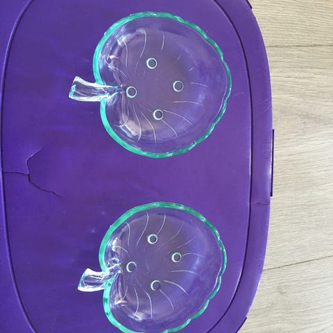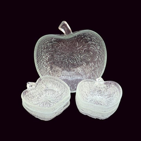 Søkeord: servise kjøkkenutstyr kjøkken matlaging servering måltid frokost lunsj kveldsmat dekorasjon pynt interiør norsk design retro samleobjekt miljø kakeasjett småkaker matretter desserter dessert kakefat retro antikk fajanse glass gjennomsiktig dessertasjett apple dessertskål dessertskåler skål