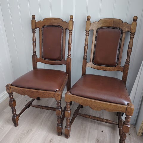 Vintage spisestuestoler i heltre og skinn gis bort