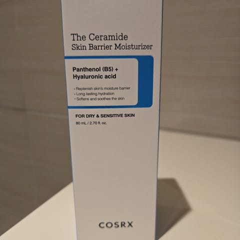 COSRX The Ceramide Skin Barrier Moisturizer er en fuktighetskrem på 80 ml som inneholder ceramider, panthenol (B5) og hyaluronsyre. Produktet er utviklet for tørr og sensitiv hud, og har som formål å styrke hudens barriere og gi fuktighet.