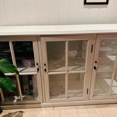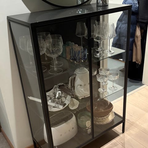 Pent brukt vitrineskap med glassdører, glasshyller og glassvegger