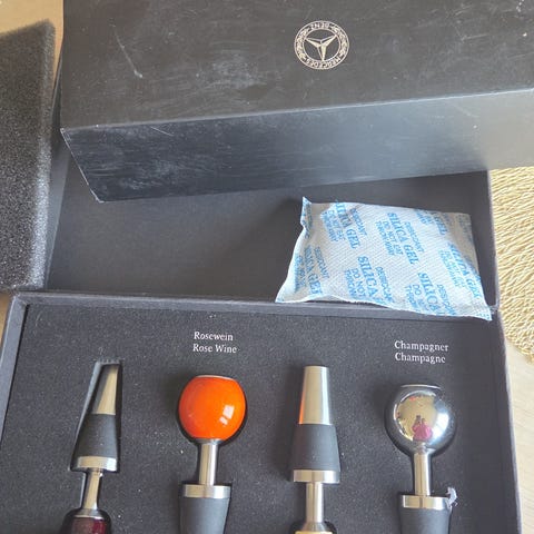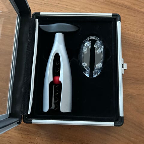Gaveeske med vinåpner sett med påtrykket logo fra Swedish Match. Inneholder vinåpner, flaskeåpner og "kork" til vinflasken. Har aldri vært brukt.