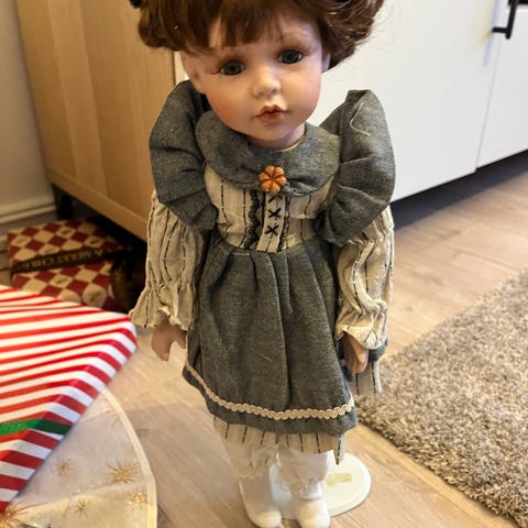 En samling av porselensdukker i ulike størrelser og klær. Dukker med detaljerte ansikter, ulike hårfarger og tradisjonelle klær. Passer til samling eller dekorasjon. Selges samlet for 1800kr eller 200kr per dukke, di veldige små dukkene selges 60kr stk