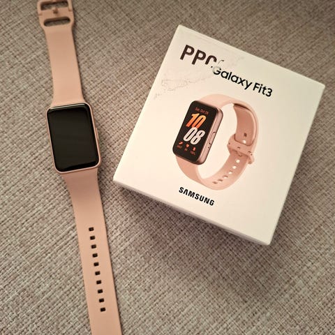 Ubrukt Samsung Galaxy Fit3 smartklokke med svart reim og skjerm. Enheten har funksjoner for helseovervåking, mediekontroll, og lokalisering. Passer for daglig bruk og treningsaktiviteter.