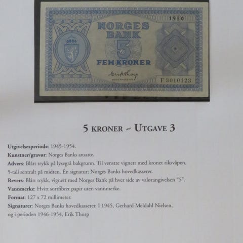 Utgitt 1917-1978 pålydende fem kroner. Interressen for disse sedlene er stor. Svært få sedler har