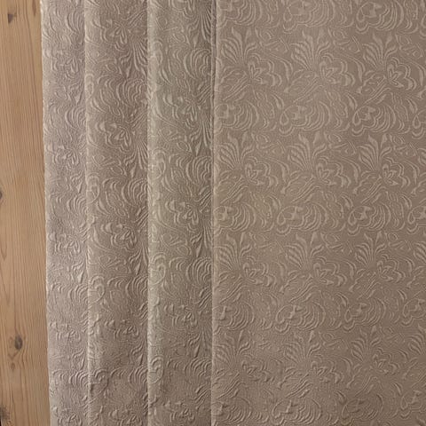 Tungt stoff som gjør at gardinene faller pent. Farge mørk beige/ lysebrune.