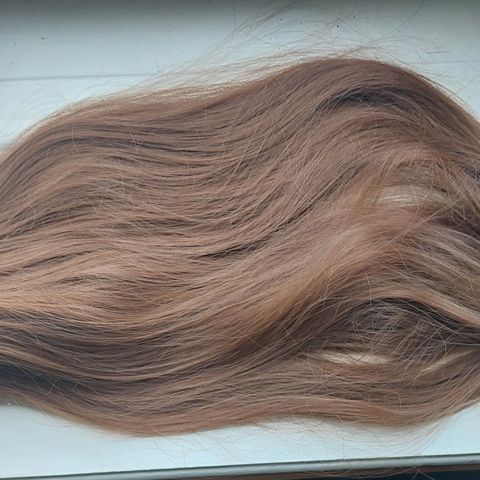 Håret er brunt med rødskjær. Ikke 100% brunt. Veldig fin farge!