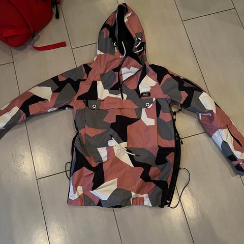 Kul og praktisk Dope anorakk, mange praktiske lommer og lett foret (derfor god og varm). Pent brukt.