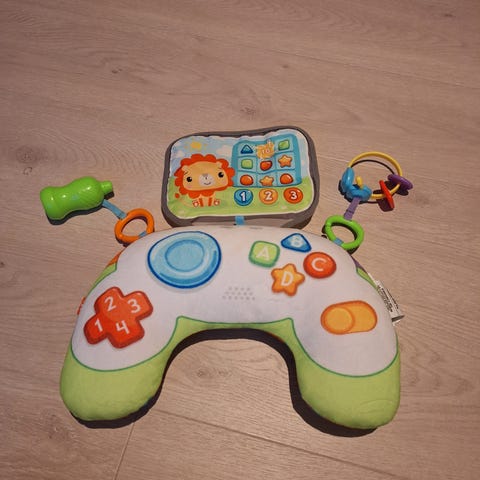 Fisher-Price barnespill med ulike knapper og farger, utstyrt med lyd- og lysfunksjoner. Designet for små barn for å stimulere læring og motoriske ferdigheter.